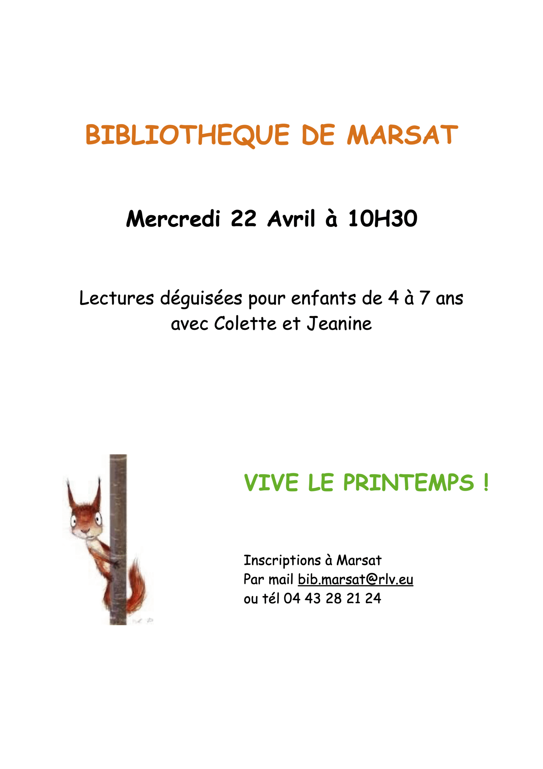 Bibliothèque de Marsat : Lectures déguisées 7 jours ago in Quand 22 avril 2026 10h30 - 12h30 Ajouter au Calendrier Télécharger ICS Calendrier Google iCalendar Office 365 Outlook Live