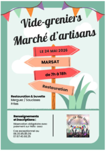 Vide grenier, marché d’artisans – Comité des fêtes de Marsat 4 semaines ago in Quand 24 mai 2026 7h00 - 18h00 Ajouter au Calendrier Télécharger ICS Calendrier Google iCalendar Office 365 Outlook Live Inscriptions : https://www.helloasso.com/associations/comite-des-fetes-marsat